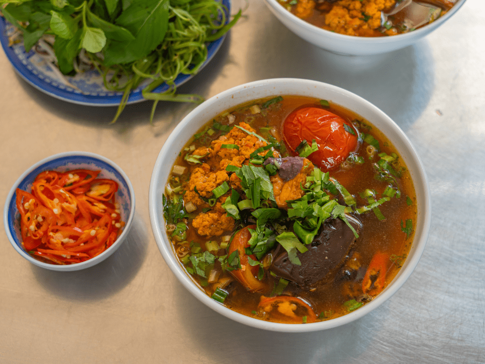 Bun Rieu is a tomato-based noodle soup often made with crab or shrimp paste, giving it a distinctly seafood flavor. It’s known for its tangy and savory broth and is usually garnished with fresh herbs, bean sprouts, and crab meat.