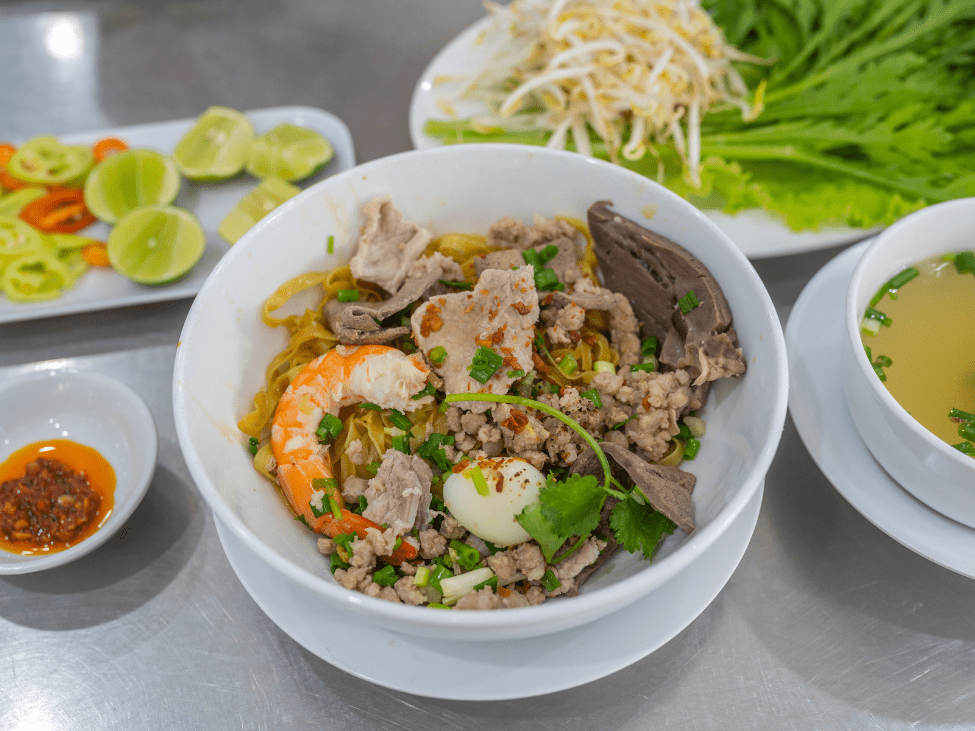 Mi Quang is a turmeric-infused noodle soup that originates from the Quang Nam province in Central Vietnam. It’s known for its unique yellow noodles, minimal broth, and a variety of toppings, including pork, shrimp, and roasted peanuts.