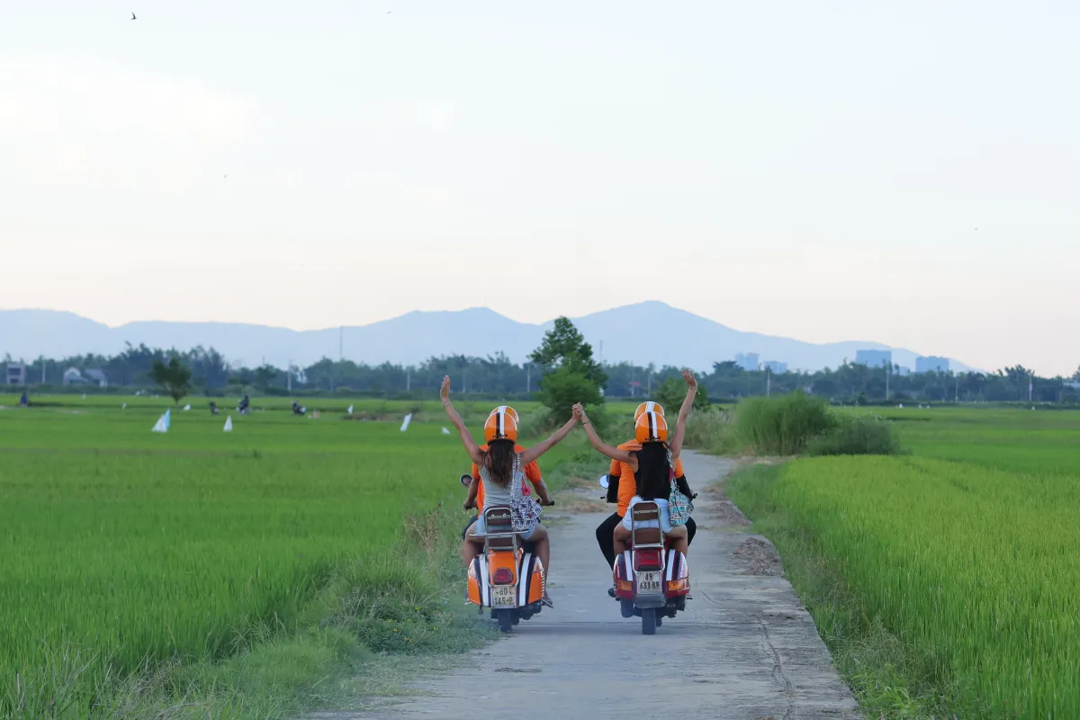 Settle into the passenger seat of a classic vintage Vespa as your expert local guide navigates quiet backroads west of Hoi An. Lush farmland and postcard-worthy views unfold with every turn. Step inside a multi-generational family home to witness the centuries-old craft of traditional rice paper-making, trying your hand at shaping your own. Cruise through tranquil farming villages where life moves at nature's pace, then visit a peaceful bamboo village to watch artisans carve the iconic Hoi An lanterns. Pause for refreshing sugar cane juice by the riverside under the shade of ancient trees, watching slow river traffic drift by. Finally, wind down at a countryside café overlooking emerald rice fields, sipping Vietnamese coffee or a cold drink as the scenery sinks in a perfect, unhurried glimpse of rural Hoi An.