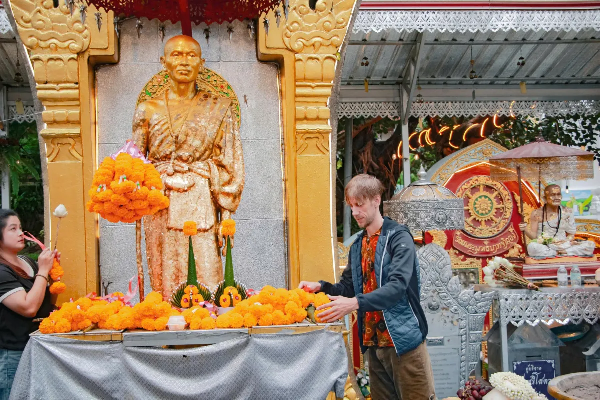 Your journey begins in the quiet pre-dawn hours. Riding through empty streets, we arrive near the Khruba Sriwichai Monument, where locals gather for a deeply spiritual tradition. Kneel respectfully as saffron-robed monks receive their morning alms—an intimate cultural experience rarely witnessed by visitors.