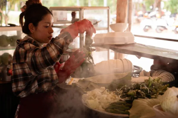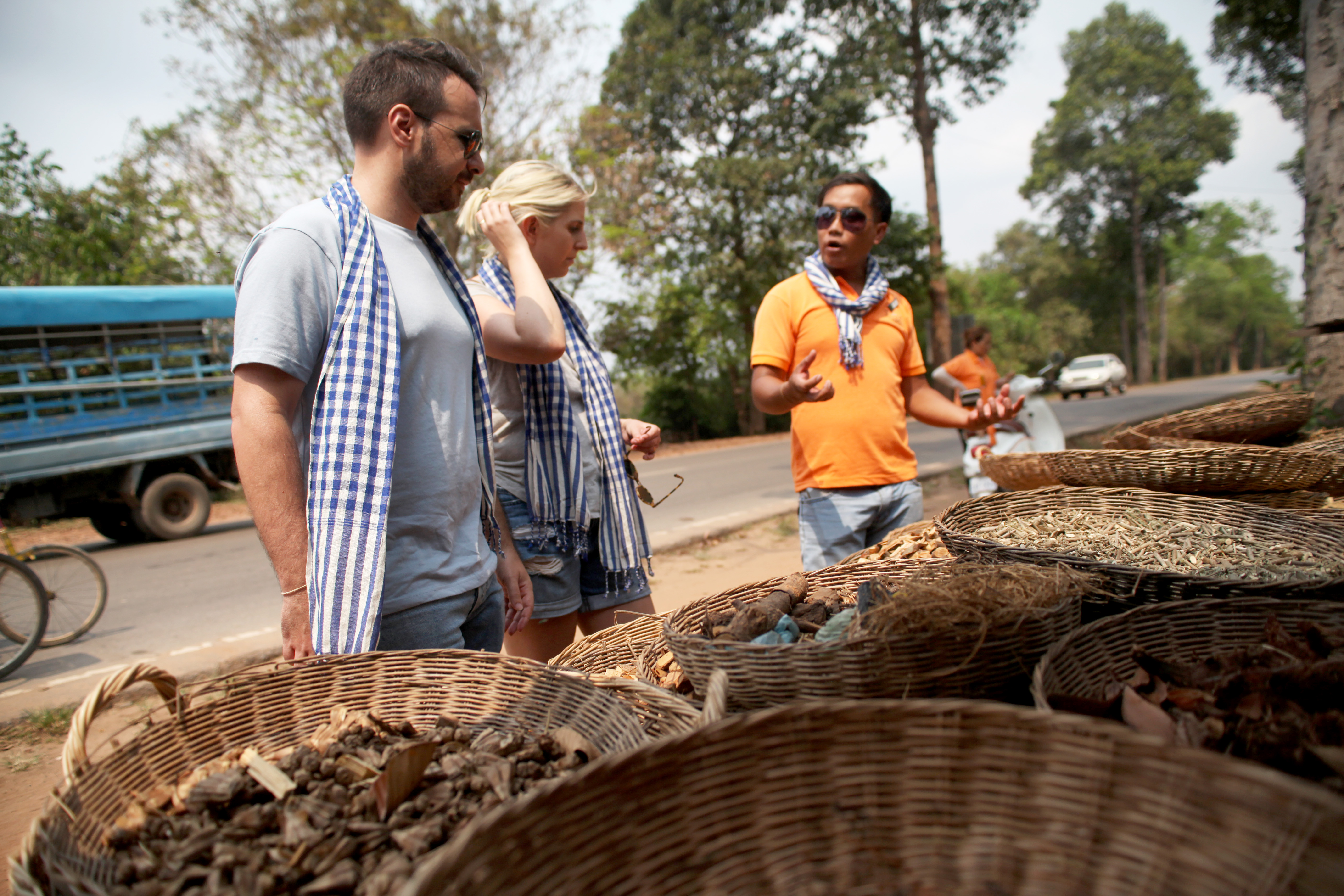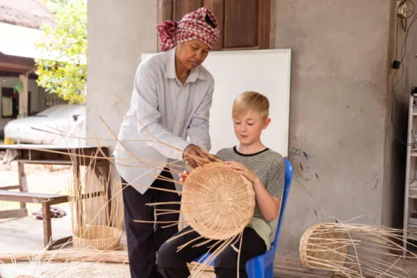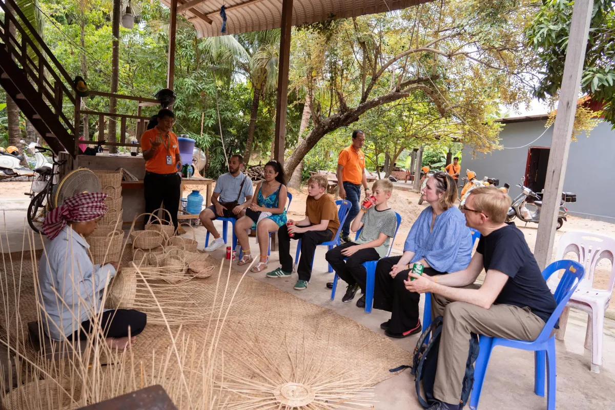 We navigate scenic back roads past rice paddies to meet talented artisans, such as rattan weavers and traditional medicine men. Along the way, savor the authentic taste of Cambodia with local snacks like sticky rice grilled in bamboo.