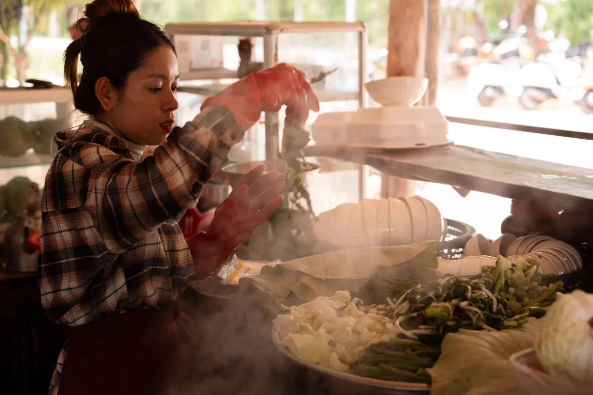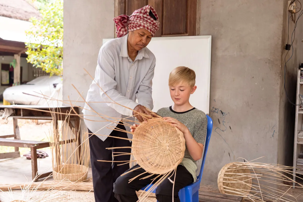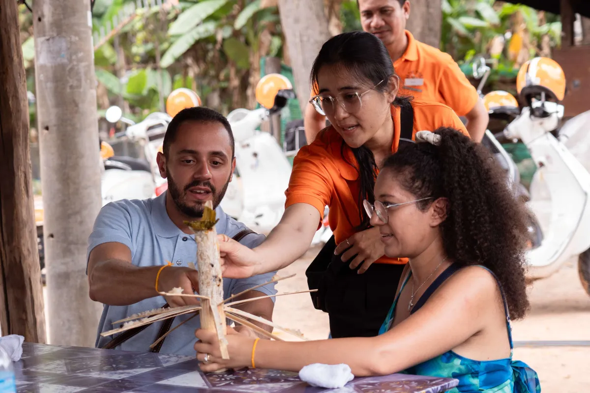 Venturing deeper into the countryside, we meet a family of rattan weavers preserving their generational craft and visit a medicine man who shares knowledge of traditional herbal remedies. Along the way, we sample local delicacies like sticky rice grilled in bamboo, prepared by village vendors.