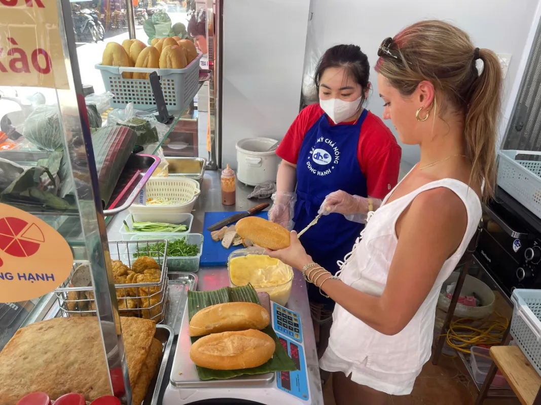 The culinary story continues as we stop for an insider's Bánh Mì tasting. You’ll bite into a perfectly crispy baguette that crackles at first touch, revealing rich fillings like pate, savory pork, and fresh vegetables. It's the perfect fusion of French and Vietnamese flavors, telling a story of the city's history in every bite.