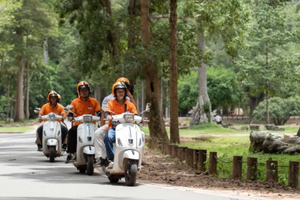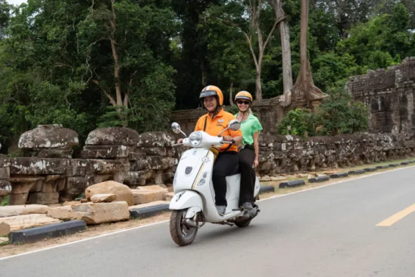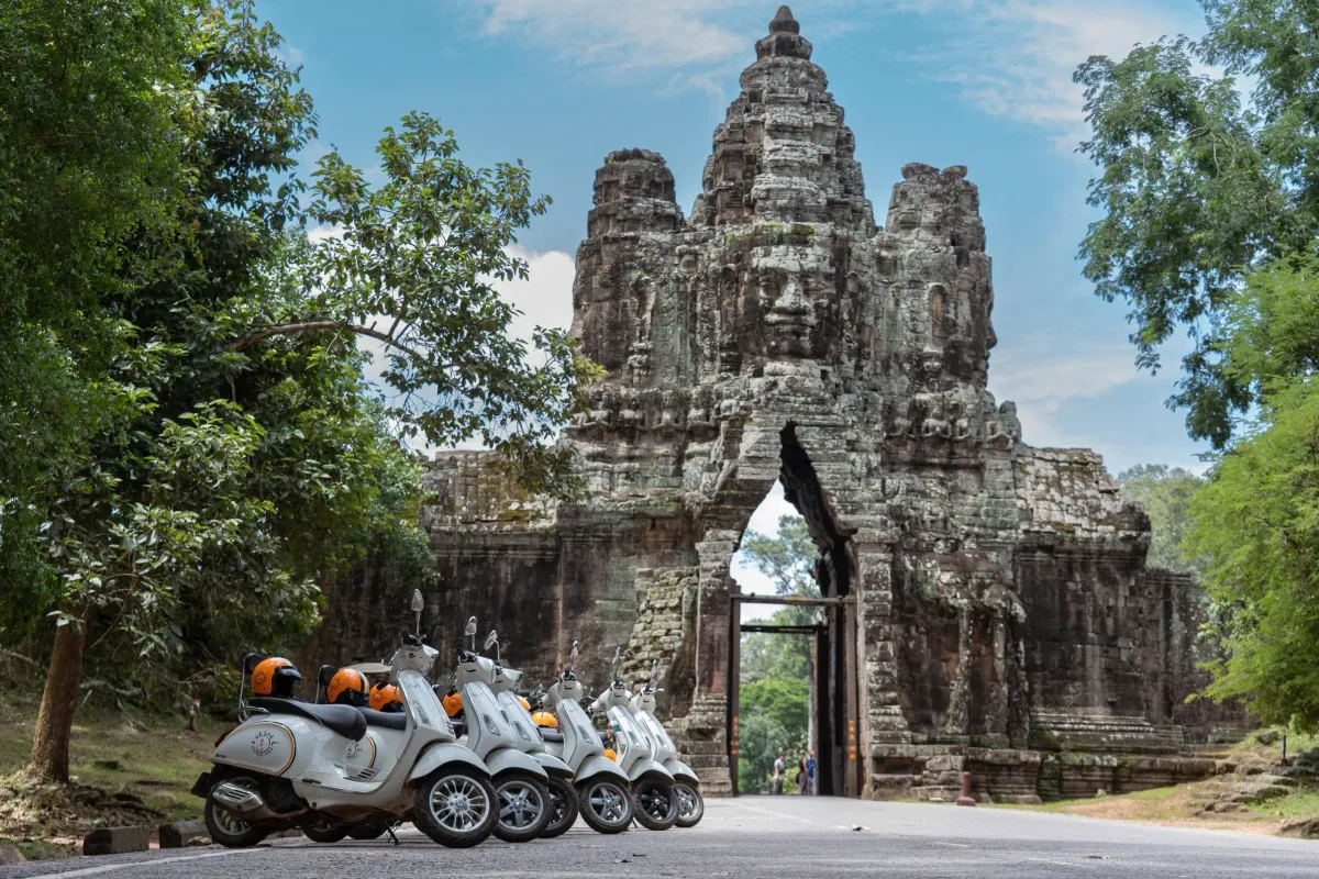 As the day unfolds, we ride deep into the heart of Angkor, exploring its most celebrated landmarks: Angkor Wat, the world’s largest religious monument Angkor Thom, the grand walled capital of the Khmer Empire Bayon Temple, known for its 216 enigmatic stone faces Ta Prohm, where towering trees intertwine with ancient ruins Between temples, your Vespa takes you along jungle trails, ancient city walls, and scenic backroads, revealing a quieter, more intimate side of Angkor.